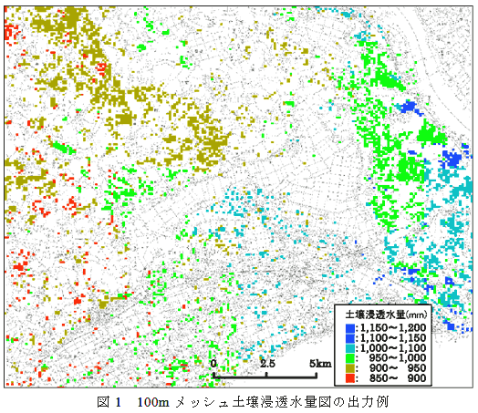 本図は平均的な年間浸透水量を推定したもので、実際の浸透水量は降雨の状況や栽培条件などによって異なる。降雨強度や作物栽培が浸透水率に及ぼす影響に関しては、今後検討を進める必要がある。 |