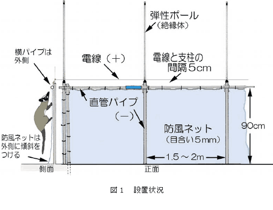 直管パイプで組んだ棚の上端部に位置する横パイプから5cm離してプラスの電線を設置し、棚全体をマイナスとする。侵入を試みるハクビシンとアライグマは垂直に設置した防風ネットを登り、棚の水平部分に足をかけプラスの導線に体の一部が触れることにより感電し侵入できない。 |