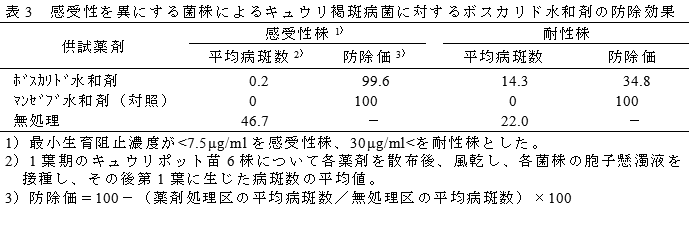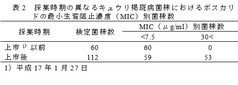 茨城県では、ボスカリドに耐性のキュウリ褐斑病菌の発生が認められる。ボスカリドの感受性菌に対する最小生育阻止濃度(MIC)は<7.5μg/mlであるが、耐性菌に対するMICは30μg/ml <である。 | ||||||||