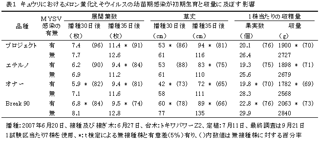 カボチャ台木キュウリはメロン黄化えそウイルス(MYSV)が幼苗期に感染した場合、初期生育が抑制され、収量は収穫初期から3割程度減少するとともに、果実に退緑斑点等を生じ、商品価値が低下する。 | ||||||