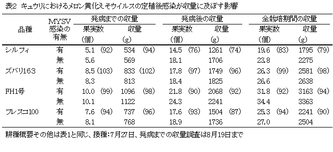 キュウリ黄化えそ病はミナミキイロアザミウマによって媒介されるウイルス病であり、その対策は媒介虫の防除が主である。このウイルス病を発症したキュウリは、栽培全般を通じて販売可能な果実が収穫できるため、感染株が取り除かれることが少なく汚染源となりやすい。しかし、その被害程度については不明な点が多いことから、このウイルスに感染した場合の被害状況を明らかにする。 | ||||||
