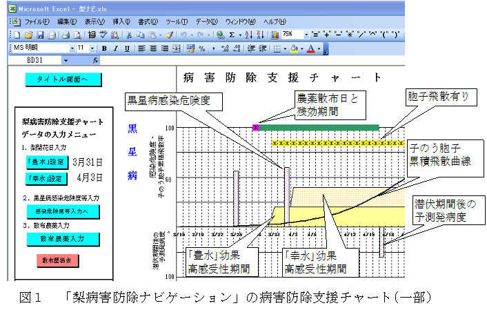 「梨病害防除ナビゲーション」はMicrosoft Excel 2003 上で稼働し、ナシ黒星病菌胞子飛散状況、黒星病感染危険度、散布農薬の残効期間等の情報をチャート化して示す。チャートで黒星病の発生生態等の理解、防除要否及び農薬散布時期の判断を容易にする。 |