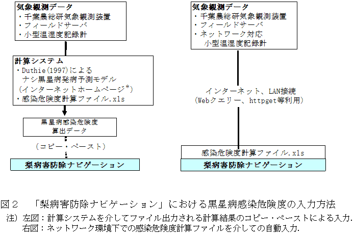 上記ナシ黒星病感染危険度は、千葉農総研気象観測装置、フィールドサーバ、小型温湿度記録計などの気象データを用いて、インターネット上のホームページ「Duthie(1997)によるナシ黒星病発病予測モデル」等により計算する(図2)。 |