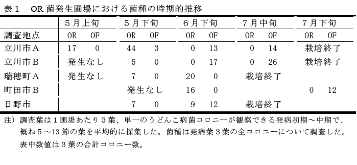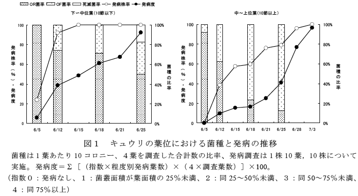 Oidium 属Reticuloidium 亜属菌(OR菌)によるキュウリうどんこ病は、東京都の広い範囲で防除が必要な程度にまで発生している。本菌の発生盛期は5月~6月中旬で、葉位によっては6月下旬まで蔓延する。7月以降は従来のFebroidium 亜属菌が優占する。 | ||||||||