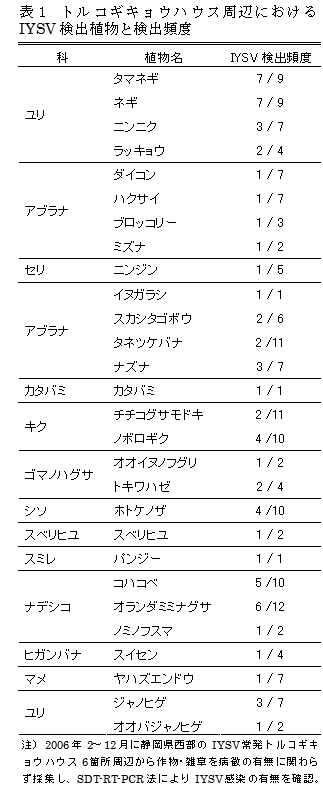 IYSVが検出された作物・雑草については伝染源植物としての可能性が考えられる。 |