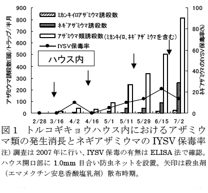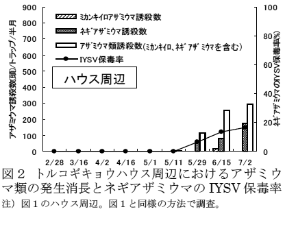 ギアザミウマは、浜松市内のハウス内において3月中旬以降に青色粘着トラップへの誘殺が確認され、5月以降は急増する傾向がある(図1)。IYSV保毒ネギアザミウマは4月上旬以降に確認され、その後保毒率は増加傾向で推移する(図1)。 |
