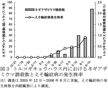 えそ輪紋病は、浜松市内のハウスにおいて3月中旬以降、ネギアザミウマの青色粘着トラップへの誘殺数増加に伴って多発する(図3)。 |