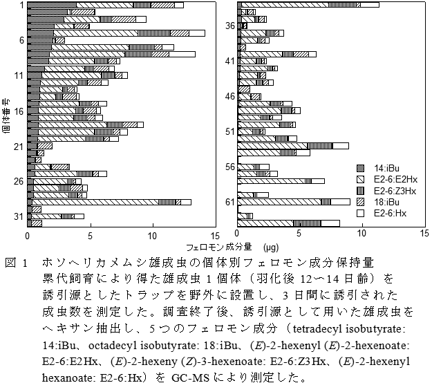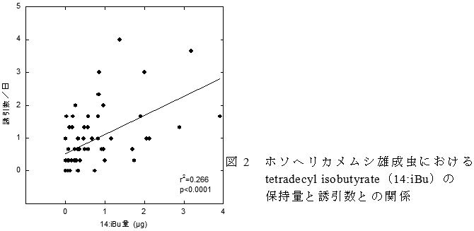ホソヘリカメムシ雄成虫のフェロモンの成分量および構成比には個体間差があり、必須成分のtetradecyl isobutyrateを保持せずに協力成分のみを保持する個体がいる。雄成虫の誘引数は、tetradecyl isobutyrateの保持量と正の相関がある。 | ||||||