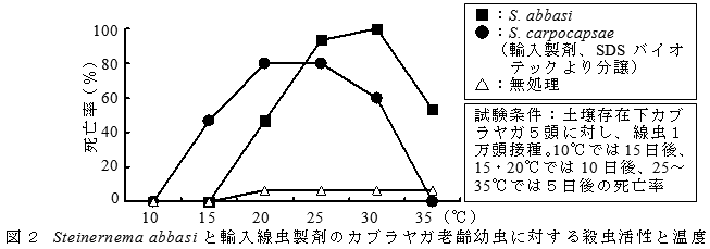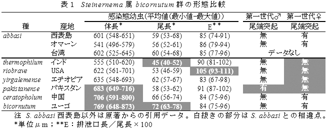 オマーン、台湾などの亜熱帯・熱帯地域からの分布が知られているSteinernema abbasi の日本における分布を初めて確認した。本種は感染態幼虫の頭部の形態から他の日本産本属種から容易に識別でき、カブラヤガ終齢幼虫に対して25~30℃で高い殺虫活性を示す。 | ||||||