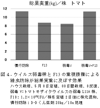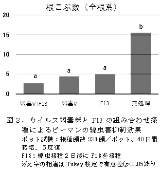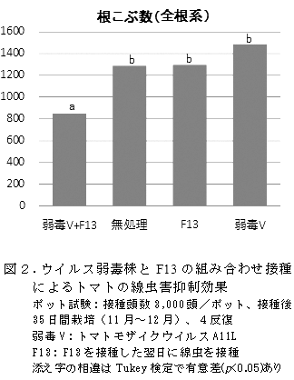 トバモウイルス属弱毒植物ウイルスをナス科のトマトとピーマンに接種して定植し、その後非病原性フザリウム菌を土壌に接種処理を行うと、ネコブセンチュウの被害の表象である根こぶの数が減少する。圃場のこの処理区の収量は慣行防除と同等である。 | ||||||||