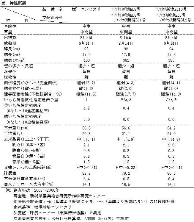 「コシヒカリ新潟BL9号」及び「コシヒカリ新潟BL10号」は、コシヒカリのいもち病真性抵抗性同質遺伝子系統同士を交配して育成した固定系統である。それぞれの真性抵抗性遺伝子型は、Pia,b 及びPii,b と推定される。 | ||||||