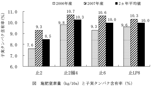 「ファイバースノウ」を用いた麦茶用大麦生産のためには、止葉展開期追肥の増施、穂揃期追肥あるいは緩効性肥料の利用により子実タンパク含有率を向上できる。作業性、経済性を考慮し、止葉展開期に速効性肥料を窒素成分で6kg/10a施用する追肥法が有効である。 | ||||||||||