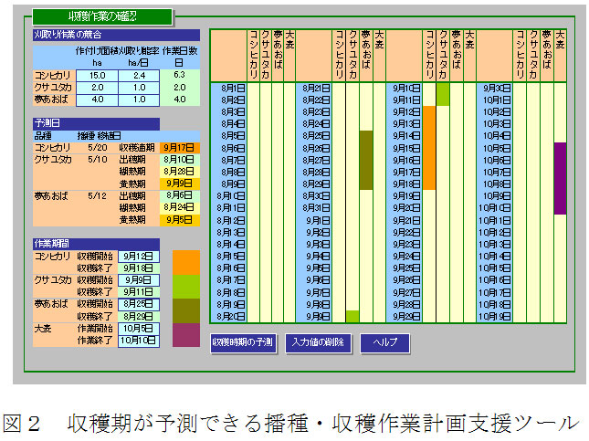 食用イネ収穫との作業競合を回避するための作付計画を立案するために、生育ステージ予測モデルに基づく「播種・収穫作業計画支援ツール」(支援ツール)が利用できる。飼料イネや「コシヒカリ」の播種日、移植日を入力すると収穫期が算出・表示され、収穫面積等を入力すると収穫期間が表示される(図2)。 |