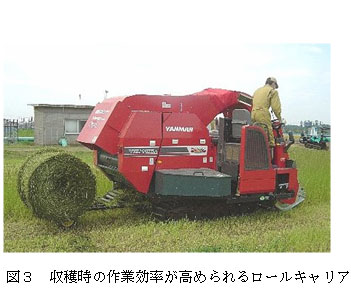 刈取り作業をしながらロールベールを運搬できるロールキャリア(図3)を使用すると作業能率を最大35%向上することができる。 |