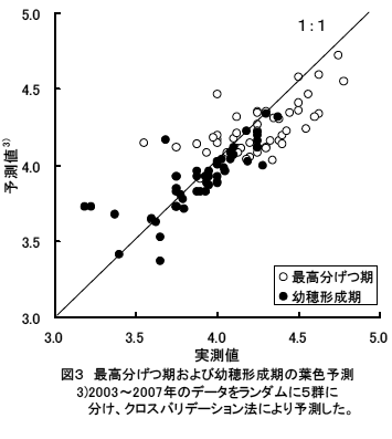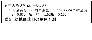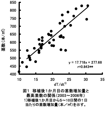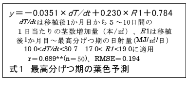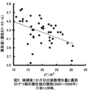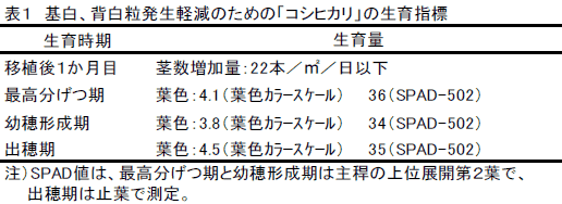 出穂期以降の葉色を適正に維持し、基白粒や背白粒の発生を抑えるためには、最高分げつ期の葉色を葉色カラースケール値で4.1に誘導するとともに、移植後1か月目の茎数増加量を22本/m2/日以下にすることが重要である。 | |||||||