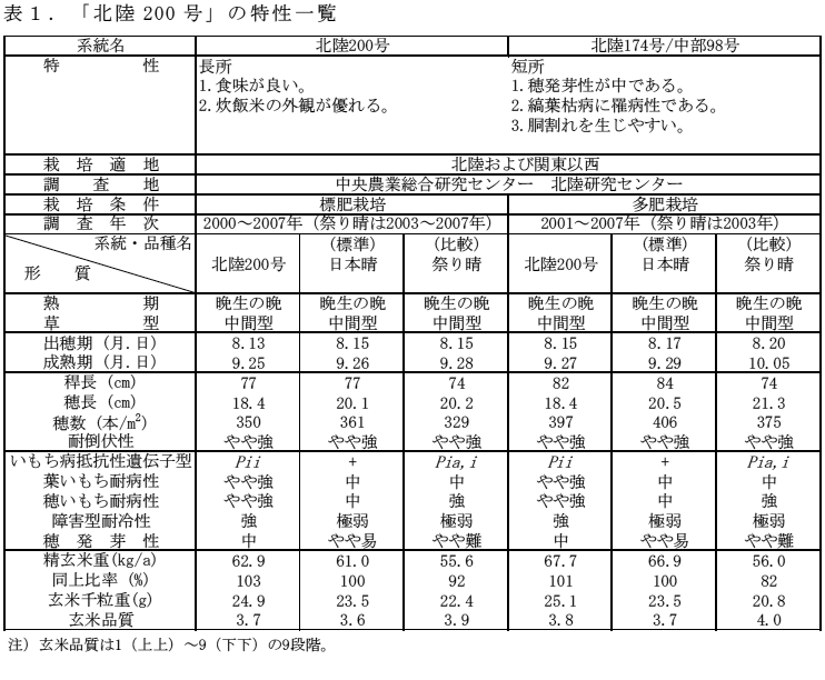 「北陸200号」は、1996年に北陸農業試験場(現中央農業総合研究センター・北陸研究センター)で良質・極良食味の晩生品種の育成を目的として、晩生の優良系統「北陸174号」と「中部98号」を交配した後代から育成された系統である。 |