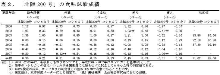 食味試験の結果は、外観で「コシヒカリ」よりやや優れ、うま味は「コシヒカリ」並で、硬さは「コシヒカリ」よりやや軟らかく、総合判定で「コシヒカリ」並である。炊飯米の保水膜の量を表す味度値は「コシヒカリ」よりやや高い(表2)。 |