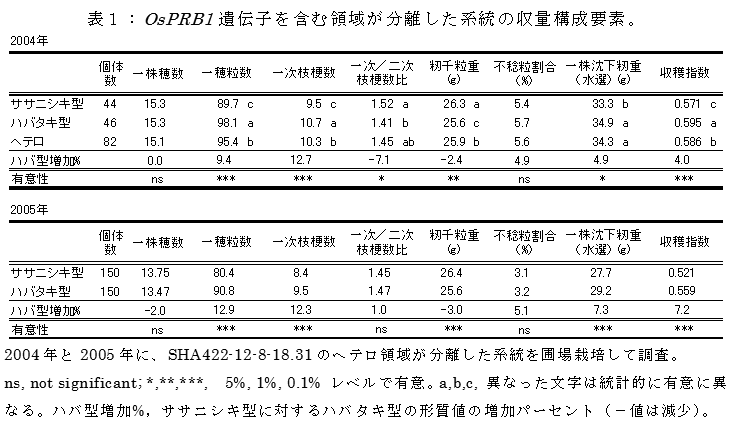 イネの一次枝梗数を制御するQTLの原因遺伝子OsPRB1 は、穂形態形成に関与するAPO1 と同一である。この遺伝子は、ササニシキ型に対して、ハバタキ型で一次枝梗数と一穂粒数を増加させ、これにより収量と収穫指数を増加させる。 | ||||||