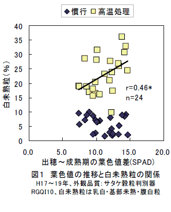 近年、高温登熟条件下において乳心白粒や基部未熟粒等の白未熟粒の多発による産米の品質低下や年次変動が大きくなっている。この背景には、良食味米生産のため窒素施肥を控える傾向にあること等によって稲体が生育後期に栄養凋落することが考えられる。 | ||||||||