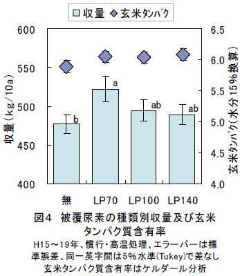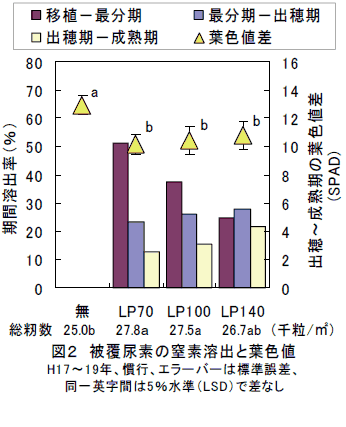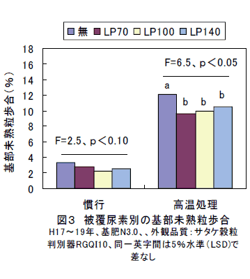 リニア型被覆尿素を基肥の速効性肥料と配合して施用すると、出穂期以降も持続的に窒素が供給されるため、出穂期から成熟期にかけての葉色値の低下を抑制できる。高温登熟条件下では、慣行施肥に比べて白未熟粒の発生が少なくなり、外観品質が高まる。 | ||||||||