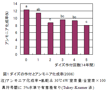 風乾土湛水培養による土壌窒素無機化量の全窒素に対する比率である、土壌のアンモニア化成率は、ダイズ作付が0~1回のほ場に比べて作付が2回以上のほ場で有意に低くなり、ダイズの作付により分解の早い有機物が消耗されたと推察される(図1)。 |