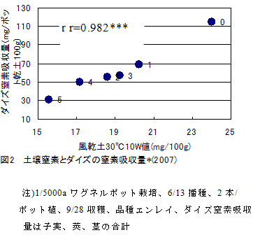 風乾土の湛水培養による土壌窒素無機化量とダイズの窒素吸収量との間には極めて高い正の相関関係が認められ、ダイズ生産力低下の要因はこの無機化量の減少が影響していると推察される(図2)。 |