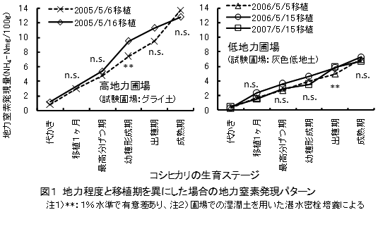 5月中旬移植の地力窒素発現パターンは5月上旬移植と比べ、高地力圃場(成熟期の地力窒素発現量が13mg/100g程度)では幼穂形成期頃の地力窒素発現量が多く、倒伏の危険性が高まる。一方、低地力圃場(成熟期の地力窒素発現量が7mg/100g程度)の場合、成熟期に至までの発現量が多くなる傾向にあるが、高地力圃場と比較すればその程度は大きくない(図1)。 |