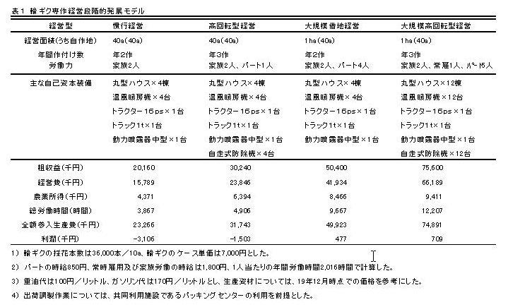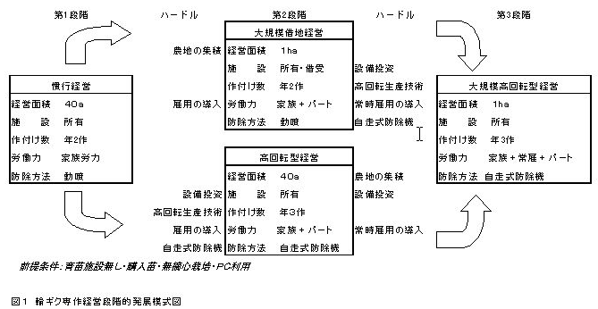 年2作体系の輪ギク専作農家が、年3作の大規模経営に発展するためには、年3作に切り替えて徐々に規模拡大していく方法と、空きハウスを集積して面積拡大をはかり、その後に年3作を導入していく2通りの方法がある。 | ||||||||||||||