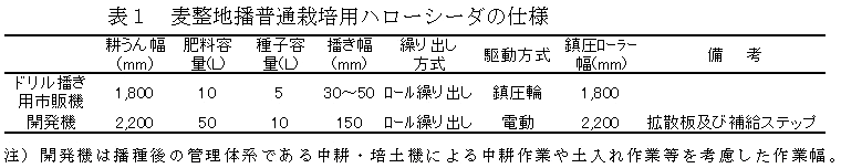 開発した麦整地播普通栽培用ハローシーダは、2.2mの耕うん幅の代かき用ドライブハローに4条の種子ホッパ(10L×4個) 及び肥料ホッパ(50L×4個)を装着したものである(表1、図1)。 |