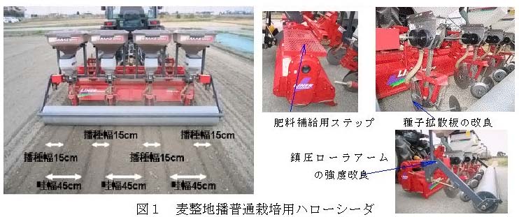 麦の栽培方式は全国的にはドリル播栽培が主流となって機械化が進んでいるが、埼玉県北部で盛んな麦整地播普通栽培(播種幅15cm、畝間45cm)では、播種や管理作業等の機械化が遅れており、整地播普通栽培用の実用的な播種機の開発が現地から要望されている。