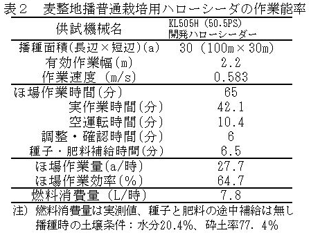 麦整地播普通栽培用ハローシーダは、ホッパに充填した種子(40L) 及び肥料(200L)のみで30a無補給作業を行うことができる。既往のアップカットロータリシーダのha当たり作業時間に比べ半分の4時間弱となり、耕起+砕土播種の2工程でも同等である(表2)。 |