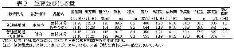 また、ドリル播平均収量に比べ同等以上の収量となり、品質や倒伏等に大差は認められなかった(表3)。 |