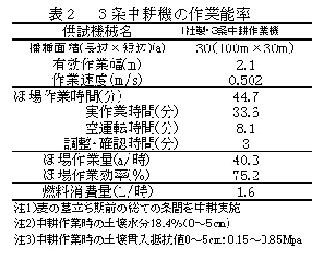 有効作業幅2.1m、作業速度0.5m/sで作業した中耕作業機のほ場作業量は1時間当たり40.3a、ほ場作業効率は75%である(表2)。また、ha当たりに換算した土入れ作業時間は約2.5時間となる。 |