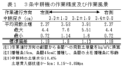3条の中耕作業機を使って、麦の条間(幅45cm)に沿って耕深3cm程度で隣接往復作業を行うと、平方メートル当たりの飛散土壌量は3.1±0.8kgとなり(表1、図1)、多少のほ場高低が認められても、平均的に土入れ作業が可能である。 |
