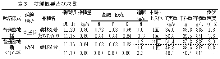 所内試験は灰色低地土・宝田統、現地実証は埼玉県北部地域沖積土壌で麦の整地播普通栽培が盛んな地域で得られた結果である。 |