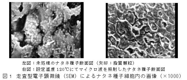 ナタネ種子の圧搾工程の前処理として、マイクロ波照射による種子加熱を行うことにより、種子細胞内の微細構造が破壊され、120℃以上の加熱では圧搾率が有意に増加し、圧搾後のナタネ油の酸価の上昇を抑制する。 |