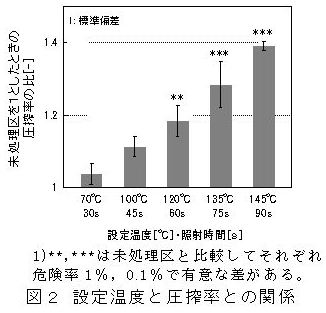 2. 120℃設定でマイクロ波照射することで未処理ナタネに対して圧搾率(種子乾物当たりの圧搾油量)に有意な差が現れ、145℃設定では未処理ナタネの圧搾率(18.8%)の1.4倍となる(図2)。 |