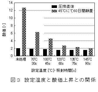 4. マイクロ波照射は貯蔵中のナタネ油の酸価上昇を抑制する効果がある(図3)。 |