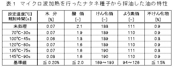 3. マイクロ波照射を行ったナタネから圧搾・ろ過(定量用5種B)した油は、食用植物油脂の日本農林規格・なたね油の水分、酸価、けん化価、よう素価、不けん化物の基準値を満たす(表1)。 |