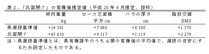平成20年4月に育種価を推定したところ、「北国関7」は枝肉重量、ロース芯面積、脂肪交雑などで県選抜基準値を大きく上回っている(表2)。 |