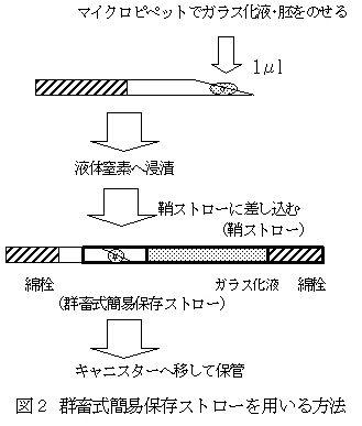 胚の保存容器は、群馬県畜産試験場で開発した安価な0.25mlの胚移植用ストローを加工したもの「群畜式簡易保存ストロー」を用いる(図2)。 |