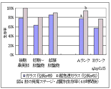 この生存率を発育ステージ別(後期桑実胚、初期~胚盤胞、拡張胚盤胞)および品質別(Aランク、Bランク)に従来のガラス化法と比較すると、いずれも超急速ガラス化法の方が高い(図4)。 |