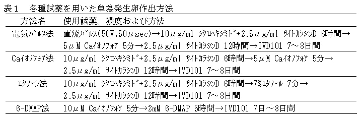 単為発生卵は、18~24時間成熟培養したと場由来卵子を用いて、電気パルス法、Caイオノフォア法、エタノール法および6-DMAP法により作出し(表1)、作出方法の違いが活性化3日後の卵割率および7~8日後の胚盤胞期への発生率に与える影響を調査する。 |