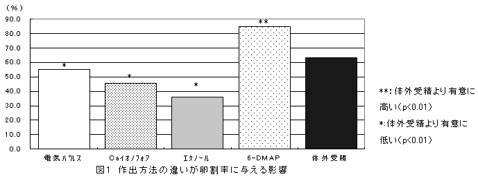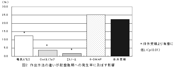 活性化刺激にCaイオノフォアおよび6-ジメチルアミノプリン(6-DMAP)を用いることで、体外受精卵と同等な胚盤胞期への発生率でウシ単為発生卵を作出できる。 |