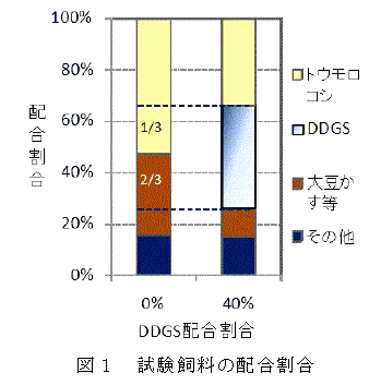 DDGSは、配合飼料中のエネルギー源としてトウモロコシの約1/3量、タンパク質源として大豆粕等の2/3量を代替し、飼料中に40%程度配合する(表1、図1)。 |