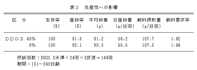 DDGSを40%配合した飼料を給与しても、産卵率、卵重、日産卵量、飼料摂取量及び飼料要求率は、DDGSを使用しない飼料と同等の成績が得られ差は認められない(表2)。 |