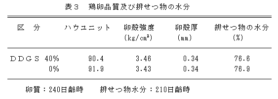 DDGSを40%配合した飼料を給与しても、ハウユニット、卵殻質及び排せつ物の水分は、DDGSを使用しない飼料と同等の成績が得られ差は認められない(表3)。 |