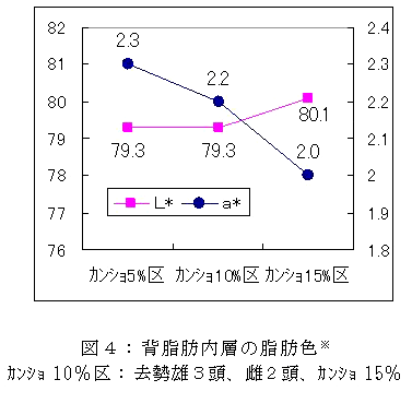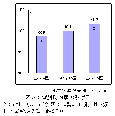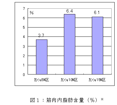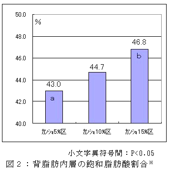 カンショの粉末を10%以上配合し、アミノ酸のリジン濃度を0.4%に調整した飼料を中ヨークシャー種の体重50kgから100kgまでに給与すると、胸最長筋の筋肉内脂肪含量が平均6%以上となる。背脂肪内層の脂肪酸組成は飽和脂肪酸含量が増加し硬く締まり、色は白さが際だつ脂肪になり特徴ある豚肉が生産できる。 | ||||||||||