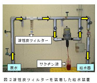 ワクチン用の飲水が確実に活性炭フィルターを通過するように、流路設定やフィルター装着方法に留意する(成形活性炭フィルターを装着すると良い)。 |