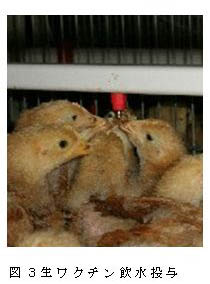ワクチンの効果:上記給水装置(図2)を用いて、鶏伝染性ファブリキウス嚢病(IBD)生ワクチン(ビュール706:メリアル・ジャパン株式会社)を3週齢のひな2,400羽に飲水投与後(図3)、7週齢で左列中央(A群)、右列前方(B群)、右列後方(C群)の3ケージから10羽ずつ採血し、IBD-ELISAキット(IDEXX社)によりIBDの抗体を測定した結果、抗体価はS/P比(平均値±標準偏差)で、A群(1.50±0.42)、 B群(1.48±0.47)、C群(1.57±0.63)と、いずれの場所の鶏群においても従来法と同等な成績が得られ、活性炭を利用した鶏生ワクチン飲水投与法は実用化可能である(表1)。 |